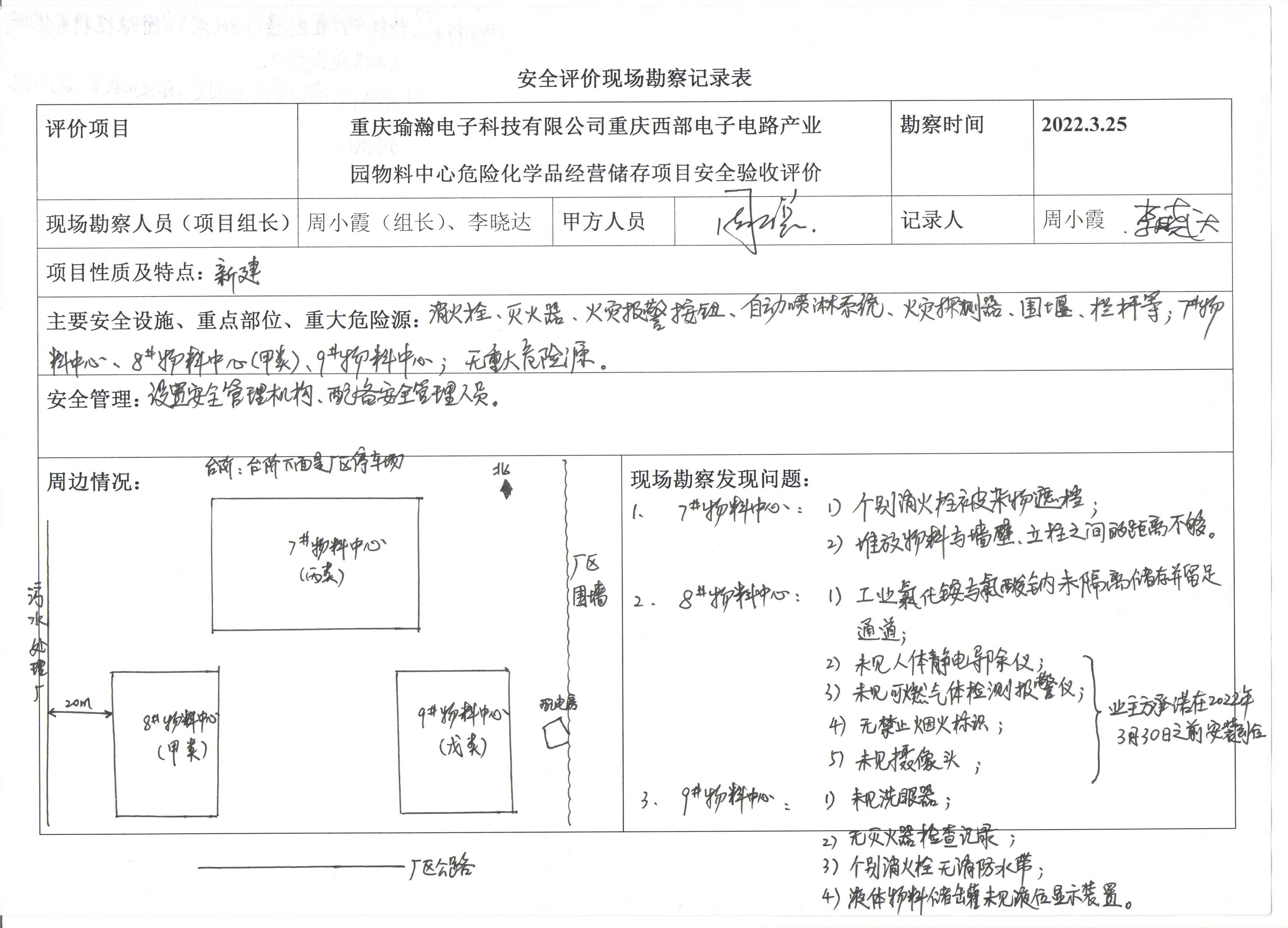項目名稱 | 重慶瑜瀚電子科技有限公司物料中心危險化學品經營儲存項目 安全驗收評價 | 合同編號 | DA-(渝)JP-2022001 | |||||