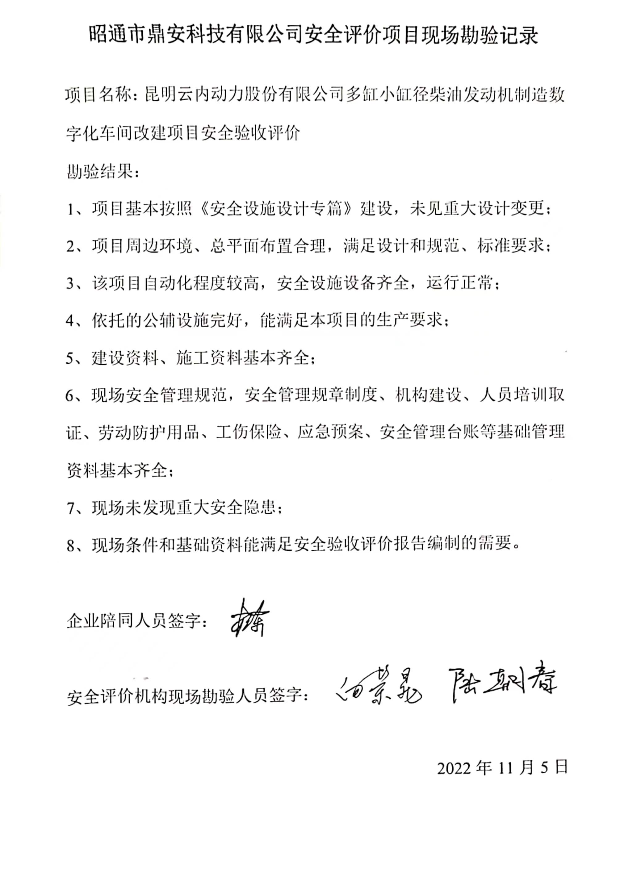 項目名稱 | 昆明云內動力股份有限公司多缸小缸徑柴油發動機制造數字化車間改建項目安全驗收評價 | 合同編號 | DAAPKM2022-78 | |||||